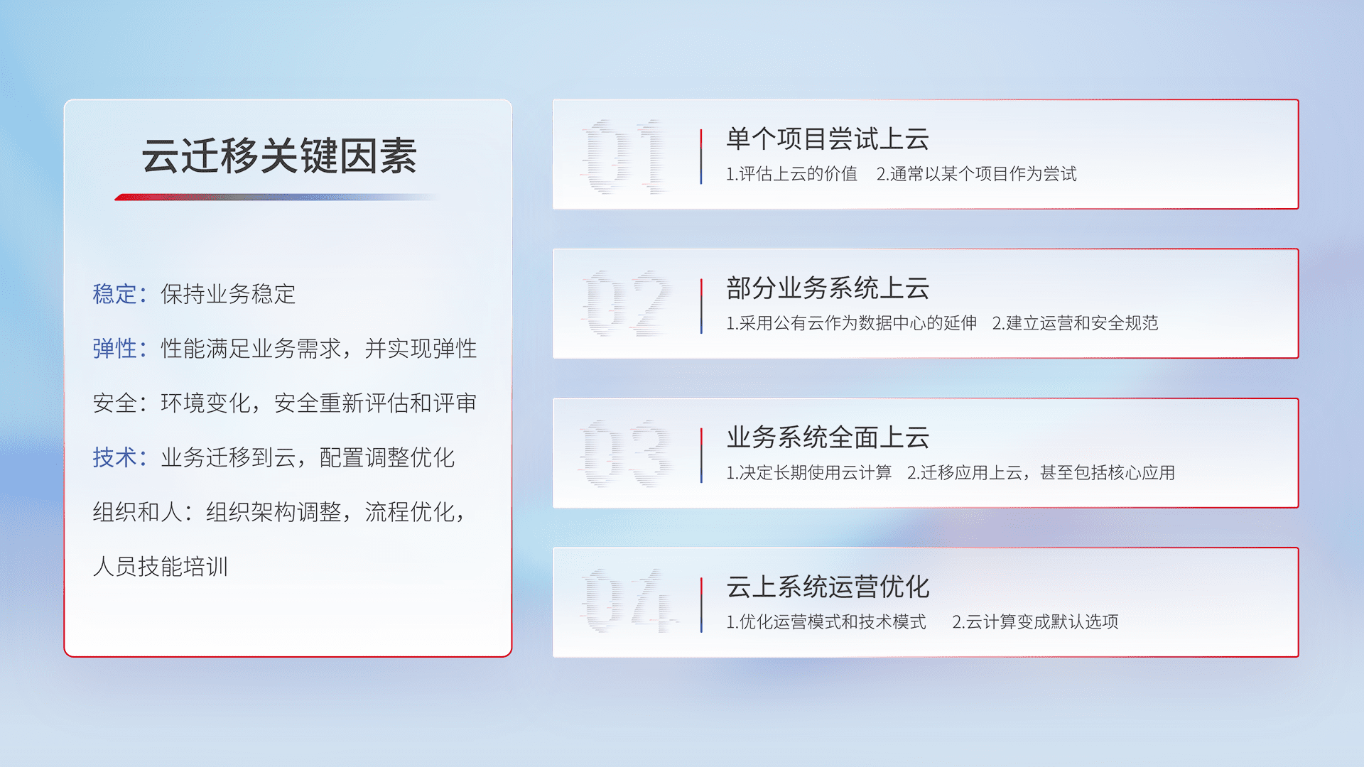 结合实际业务,,从规划设计、、、、云平台选型、、、、云原生改造、、、、数据迁移、、、集成交付,,,迁移全过程为客户识别最佳上云路径,,做好风险识别管理,,设计网络架构、、身份权限、、、、安全审计合规、、操作审计、、、、日志审计、、、监控告警策略、、多站点容灾设计等,,,,对云上基础设施进行整体规划,,提升IT治理水平,,以满足弹性、、高可用、、高性能的需求。。。。