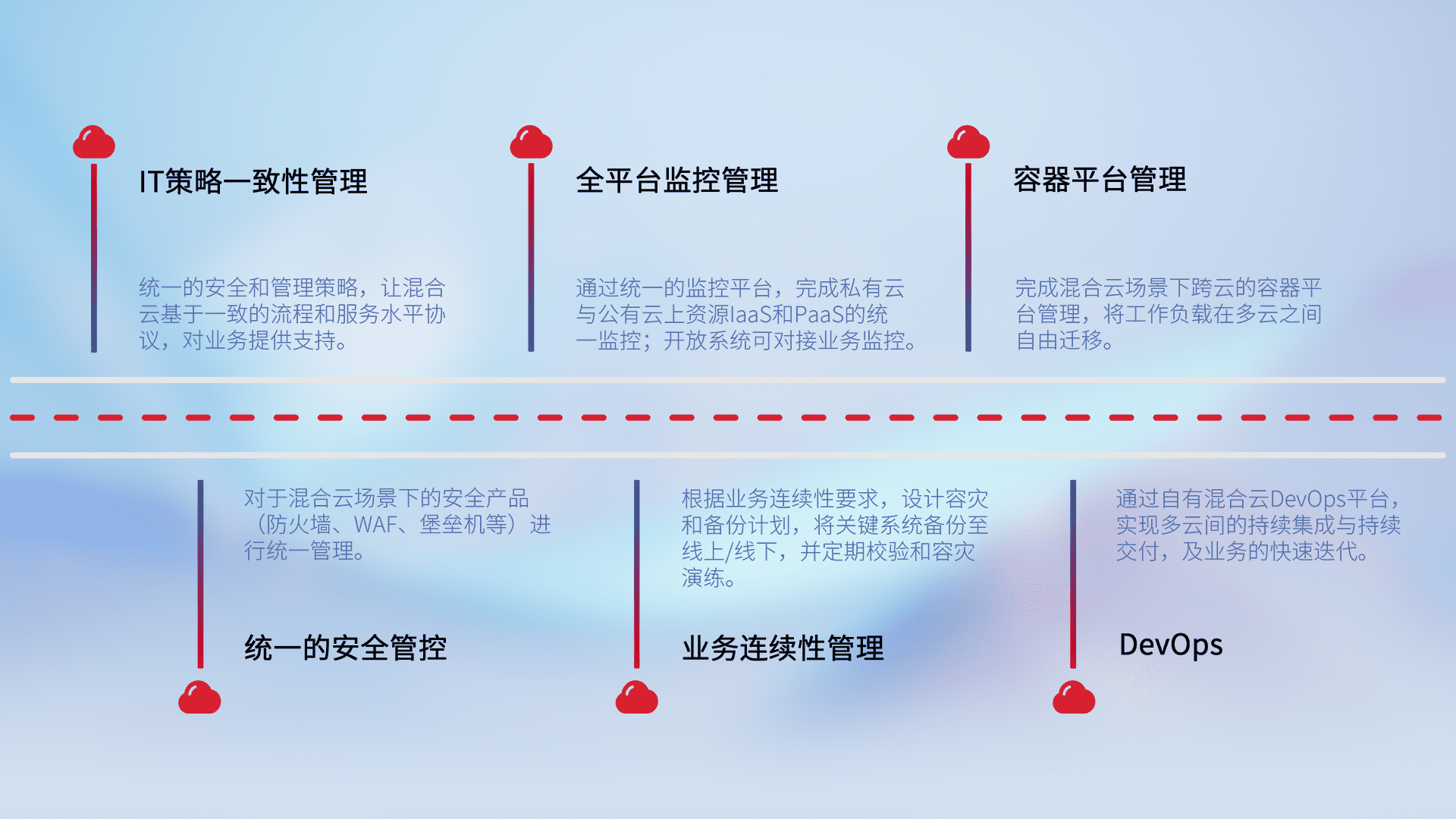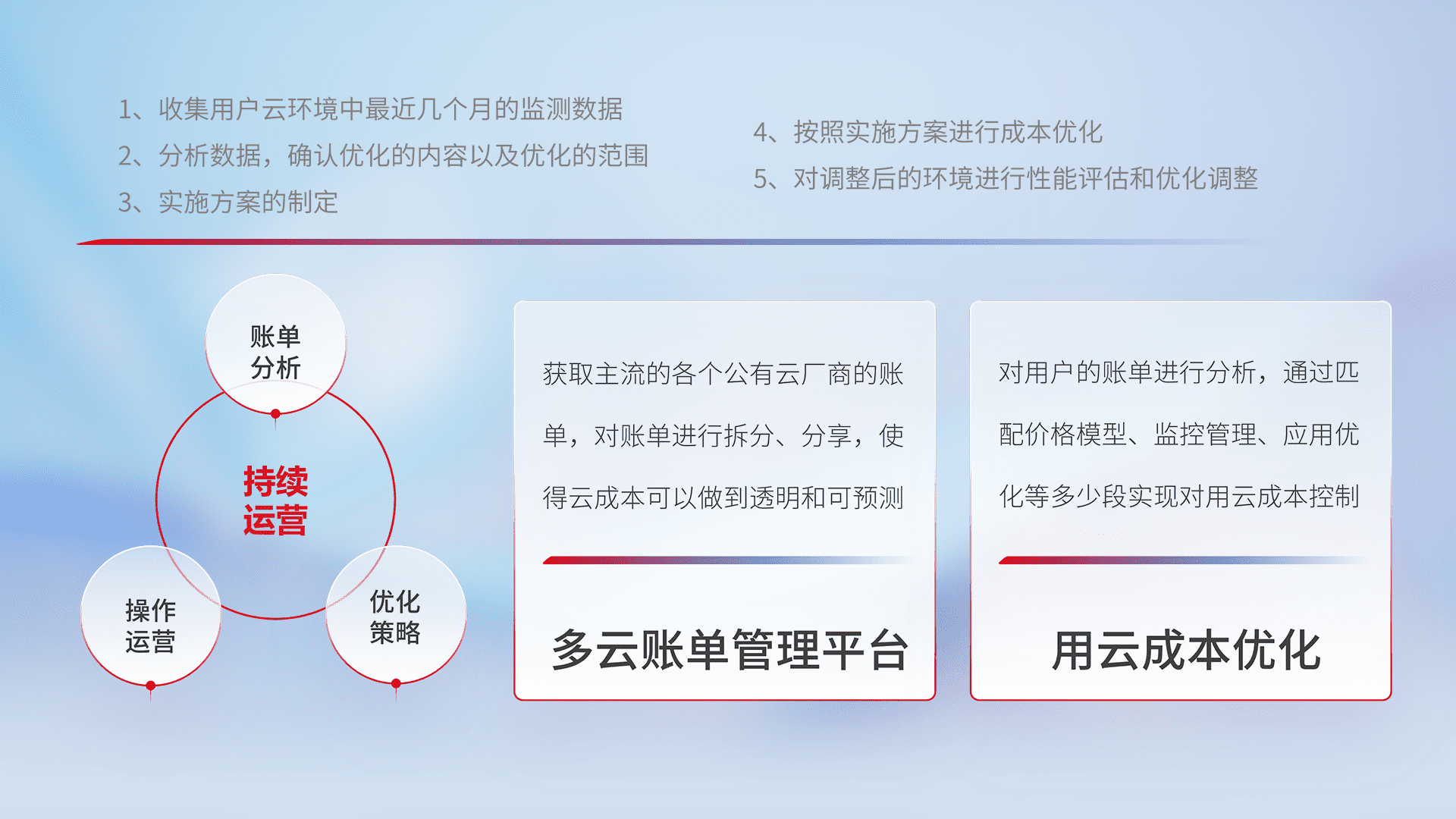 通过多云纳管,,,,以统一的资源数据模型把客户的云资源进行抽象和封装,,,,进而实现对多云资源的统一操作,,保障云资源管理的可靠性、、稳定性与可用性。。量身定制化运维内容,,,配置、、、、开发运维、、、、补丁管理、、、、备份、、监控、、、认证和访问管理、、、、审计和日常巡检等,,,,保障在用云过程中的可靠度,,稳定度以及高可用率。。