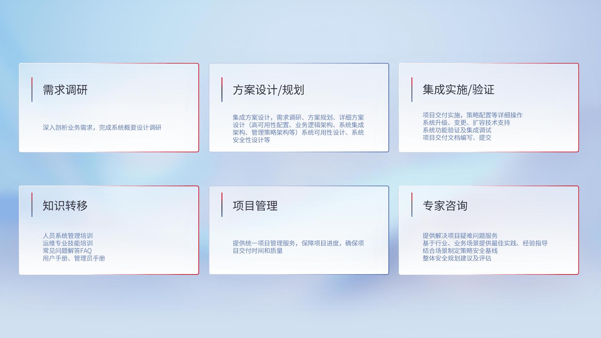 针对客户行业特性,,将宏观的安全战略和需求,,通过专业的交付服务,,实现项目落地,,,,为客户提供标准规范的集成交付服务。。